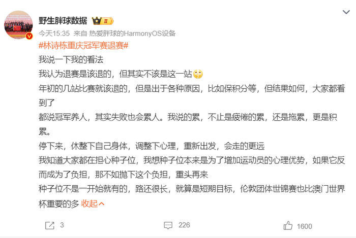 大V认为林诗栋在2026赛季前几站就该退,为了林诗栋保积分效果很差,早点退赛休整身体,调整心理会走得更远,不要担心种子位被抢走,放下这个包袱重头再来,种子位不是一开始就有,路还很长。