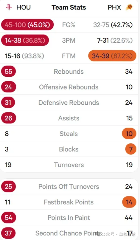 正如我们第 38 期节目所总结的,火箭一路拿到 50 胜的核心关键数据,正是全场篮板占优+接近四成的三分命中率。本场比赛数据完美印证这一点:火箭前场篮板以 24-12 碾压太阳,多出 14 个;全队三分命中率 36.8%,虽未达四成,但已足够支撑进攻。
