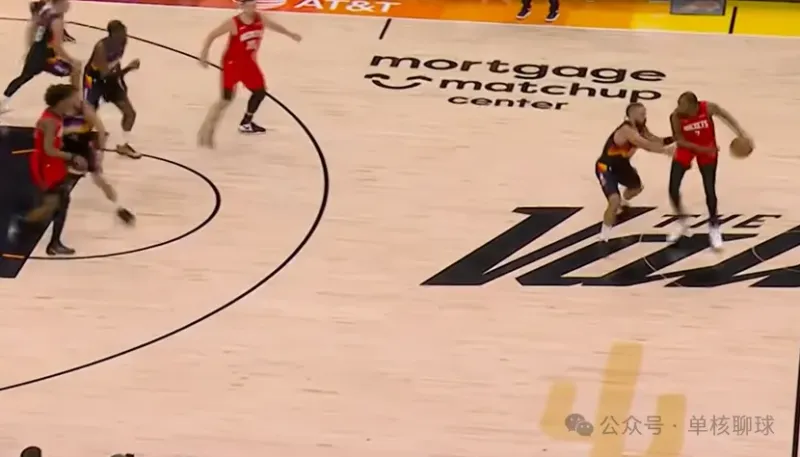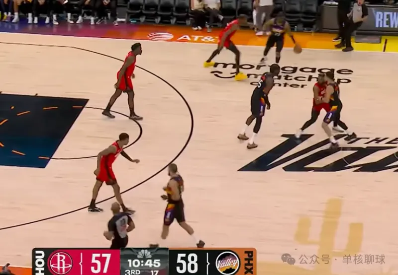 泰特登场后,完美替代了芬尼史密斯的功能性角色,火箭也随之启用理想中的无限换防策略,贴合五锋阵容的防守设想。但小贾巴里・史密斯面对布克时,始终无法完成有效限制,成为太阳针对的防守突破口。
